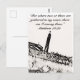 Cartão postal com imagem da silhueta da igreja e cruz com um versículo bíblico em preto e branco.