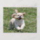 Cachorro Shih Tzu branco e creme correndo alegremente com seus ouvidos soprando e um grande sorriso em seu rosto querendo que alguém jogue com cartão postal fotográfico