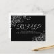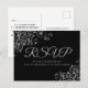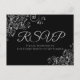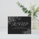 Estes belos cartões-postais de resposta de RSVP tornarão fácil para seus convidados responderem ao seu convite de casamento com o número de participantes e uma escolha de refeição, ou para enviar seus pêsames. O design é simples, mas elegante, com texto cinza prateado e uma borda de filigrana floral prateada em relevo em um fundo preto.