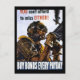 As obrigações foram uma parte importante do esforço de guerra e ajudaram a financiar a dívida maciça necessária para sustentar os militares e os aliados dos EUA. Essa imagem iguala a compra de laços com a luta do soldado no campo em termos de importância. Esta é uma correlação importante no mundo da propaganda, implicando que "você também pode ter um impacto, mesmo que não seja um soldado." Notem o impressionante atirador e o avião que ele acabou de derrubar...tudo possibilitado pela compra de títulos de guerra.