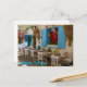 Um pátio colorido de restaurante em Alaçatı, Turquia com uma bandeira turca pendurada na janela, enquadrada por persianas azuis. Este cartão postal é totalmente personalizável.