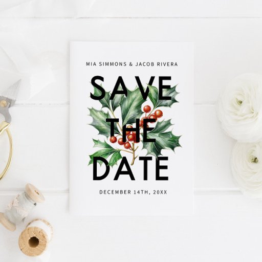 Vintage retroativa em negrito Holly Salve a data Cartão-postal. Escolha do excelente para o casamento no inverno.