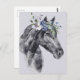 A bela pintura aquosa apresenta um cavalo preto com coroa floral sobre fundo lilático pálido.