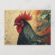 Um retrato impressionante de um galo preto com uma crista vermelha vibrante, colocado contra um fundo ornamentado de padrões vermelhos, amarelos e verdes giratórios para um estilo ousado e artístico.