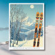 Bom dia das montanhas nevadas de Megève, Alta Saboia, França, na Europa! Esperamos que você esteja tendo umas férias de esqui maravilhosas. Este cartão postal apresenta uma paisagem montanhosa azul-acinzentada deslumbrante com tábuas de esqui retrô em um padrão tribal laranja.