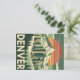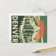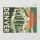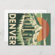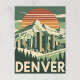 Um poster de viagens retrô apresenta o horizonte de Denver aninhado na base de uma grande cordilheira, com capa de neve, sob um sol riscado, cercado por pinheiros, com "DENVER" exibido de forma destacada no fundo.