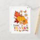 Cartão de saudação colorida com estilo de ranhura retrorreflector. A tipografia retrô elegante "Feliz Dia de Ação de Graças", com flores bonitinhas, borboletas, folhas de outono e abóbora. O cartão contém uma mensagem de boas-vindas maravilhosa no verso, que pode ser personalizada.