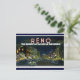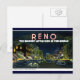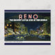 Vintage com a ilustração de Reno à noite. Luzes coloridas e carros velhos com uma fonte néon rosa "Reno" no topo com "A maior pequena cidade do mundo" em branco abaixo. É uma cena da Virginia Street em Reno.