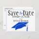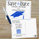 Envie este modelo de anúncio de postcard "Salve a Data" azul e preto com Código QR para a reunião de sua turma. Personalize o texto nos campos do modelo para a frente e verso, adicione o link apropriado para o seu Código QR ou edite usando a ferramenta de design para selecionar um estilo de fonte, tamanho e cor de sua preferência.