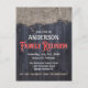 Um convite para a posta de uma reunião de família de estilo rústico, com uma pá e um motif de madeira de celeiro escuro. O verso tem espaço para detalhes especiais e informações de contato RSVP.