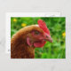 Esta galinha ovitosa pára num campo de erva coberto de flores amarelas antes de atravessar a estrada! Uma foto de macro colorido de fechamento lindamente detalhada mostrando um solteiro de galinha vermelha Rhodey ou Rhode Island longe da colher.