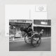 Foto em preto e branco de um carregando rickshaw, dois turistas pelas ruas de Kyoto.