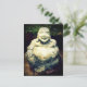 Esta é uma figura concreta de um Buda alegre e alegre, redondo e alegre em um cenário de jardim com camas verdes e plantas bonsai ao fundo.