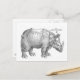 O Rinoceronte de Albrecht Dürer é uma madeira que ele baseia em uma descrição escrita e um breve esboço de um artista desconhecido de um rinoceronte indiano que havia chegado a Lisboa no início desse ano. Dürer nunca viu o verdadeiro rinoceronte, que foi o primeiro exemplo vivo visto na Europa desde os tempos romanos. No final de 1515, o Rei de Portugal, Manuel I, enviou o animal como presente para o Papa Leão X, mas morreu num naufrágio ao largo da costa italiana no início de 1516. Um rinoceronte vivo não foi visto novamente na Europa até que um segundo espécime da Índia chegou ao tribunal de Philip II na Espanha de cerca de 1579[2][3]. O corte de madeira de Dürer não é uma representação exata de um rinoceronte. Ele retrata um animal com placas de duro que cobrir seu corpo como lençóis de blindagem, com um gorget na garganta, uma placa de peito sólida, e rebites ao longo das costuras; e uma pequena buzina torcida nas costas, pernas escaldantes e traseiras semelhantes a serras.