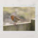 Um Tordo-Europeu (Erithacus rubecula) em pé numa cerca de madeira no The Rising Sun Country Park, Newcastle upon Tyne.