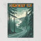 Um poster de viagens retrorreflector retrata a autoestrada 101 se enrolando ao longo de uma costa dramática, flanqueada por pinheiros altos, com ondas do oceano batendo contra a costa sob um céu suave e nublado. "HIGHWAY 101" é exibido com ousadia no topo.