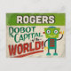 Uma design engraçada do Rogers Arkansas com um robô amigável com texto retrô divertido que diz, "Rogers, Robot Capital do Mundo!"