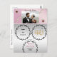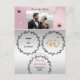 A design apresenta uma combinação de padrão metálico rosa-dourado com prata. A floral de prata emboscada contém informações que você deseja transmitir na época. Um número exclusivo de ouro e brilho e uma fileira de pérolas brancas onduladas atrás da foto personalizada adicionam chic ao design final. Personalize sua própria mensagem na parte traseira do cartão.