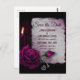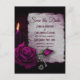 Salve o cartão postal da data. Projetado com uma aparência gótica. Um velho papel-pergaminho cinza com pingos de vermelho roxo em volta das bordas. Um rosa magenta de cheio florescente, um rosebud, uma vela e um cesto prateado em fundo escuro cria um belo e misterioso cartão de data.