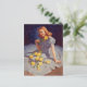 Cartão PinUp clássico que mostra uma bela garota pinUp posando no chão de um vestido branco e um buquê de rosas amarelas, pintada por Art Frahm (1907-1981)