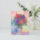 trabalho de arte floral tradicional com rosas vermelhos e roxos floridos num vaso com fundo colorido num cartão postal.