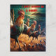 Uma pintura vibrante capturando um grupo de galos coloridos que se esforçam confiantemente num campo luxuoso sob o sol brilhante, mostrando suas penas e engajando-se em interação lúdica.