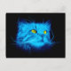 Um rosto de gato azul fraturado com olhos amarelos espantosos contra um fundo preto.