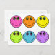 Este cartão-postal apresenta faces emoji em rosa, laranja, amarelo, azul verde e roxo com diferentes olhos coloridos e grandes sorrisos felizes.