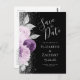 Este elegante cartão moderno de salvar a data apresenta um design floral roxo e lavanda aparado com brilho prateado falso. O texto personalizável combina caligrafia manuscrita e fonte copperplate em cinza prateado sobre um fundo preto. O lado reverso repete as informações, juntamente com um endereço de retorno personalizável.