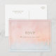 Neste verão, o cartão postal de casamento de cor d'água do pôr do sol RSVP é perfeito para o seu casamento de boho de praia tropical. Concebido com coral de pêssego, minimalista, cor de pêssego laranja e cor de água azul empoeirada, acompanhado de uma simples tipografia de ouro arenoso-rústico. Tem certeza que combina com as suas vibrações de casamento do destino costeiro da boêmia.