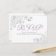 Estes cartões postais RSVP lindos facilitarão aos seus convidados responder ao seu convite de casamento com o número de participantes e uma seleção de refeições, ou enviar os seus arrependimentos. O design é simples, mas elegante, com texto roxo e cinza e uma borda floral de folha de folha fina prateada.
