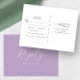 Elegantemente desenhado para combinar com nossa papelaria de casamento de lavanda d'água, este cartão postal RSVP é uma verdadeira personificação de um romance botânico. Mostra imagens minimalistas de flores lavandas. Este cartão-postal proporciona cuidadosamente um espaço dedicado para os convidados confirmarem a sua presença e escolha de refeições. A palavra "Responder" é definida na tipografia elegante do script sobre um fundo roxo correspondente. Ideal para casamentos rústicos e jardineiros, esta peça é um testemunho da única artista de Victoria Grigaliunas do Do Tell A Belle. Descubra a papelaria correspondente e muito mais em www.zazzle.com/dotellabelle.