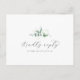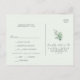 Este cartão postal de escolha elegante de menu verde RSVP é perfeito para um casamento simples. O moderno elegante design apresenta uma disposição botânica natural de eucalipto, folhas e plantas com um sutil sotaque de hortelã verde-aquarela. Este cartão postal de resposta do casamento pergunta aos convidados qual refeição eles gostariam na sua recepção.