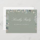 Um cartão RSVP de pedido de música elegante com verde floral e tipografia quic em um fundo verde sage. O inverso apresenta os seus detalhes e uma solicitação divertida de música de convidado. Projetado por Thisnotme©