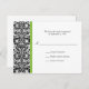 Um padrão de wallpaper damask preto-e-branco com sotaques de verde limão destaca esta placa de resposta clássica. Facilmente personalizado com suas próprias informações. Certifique-se de alterar seu endereço de devolução na parte traseira. Disponível em cores alternativas com cartões de salvamento, convites, cartões de recepção e favores correspondentes.