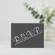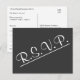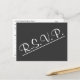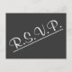 Este elegante e respeitável design postal R.S.V.P apresenta a mensagem "R.S.V.P." na frente. Ele também apresenta um formulário de RSVP personalizado na parte traseira para que o destinatário seja concluído, juntamente com um endereço personalizado ao qual as placas de RSVP completadas seriam enviadas. Cartões RSVP como este talvez pudessem ser usados para descobrir quem vai participar de uma festa de aniversário de casamento, de uma festa de formatura, de um chá de fraldas ou de outro evento.