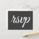 Esta placa RSVP simples e elegante apresenta a mensagem "rsvp" na frente em texto branco sobre fundo de cinza escuro. A parte traseira apresenta um formulário RSVP personalizável e um endereço personalizado.
