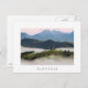 Cartão-postal da igreja das Ruas Thomas (Sveti Tomaž), sobre uma colina rodeada por nevoeiro matinal no interior da Eslovênia, perto de Skofja Loka, durante um nascer de sol cor-de-rosa, com montanhas alpinas no fundo com uma fronteira branca e o texto: "Eslovênia".