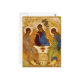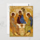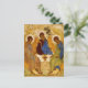 Antiquado Andrei Rublev trabalho de arte/ícone representando o Pai, o Filho e o Espírito Santo sentados numa mesa. As imagens parecem ter asas de anjo.