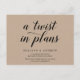 Este é o moderno e mínimo rústico design Kraft limpo, temido, em preto, o convite de Festa de casamento Reprogramado (adiado/adiado) (Uma reviravolta nos Planos). É a maneira perfeita e elegante de fazer o anúncio de reagendamento para seus amigos e família.