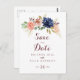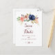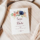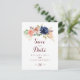 Este ouro rústico e floral salvando o cartão-postal é perfeito para um casamento moderno. O design apresenta uma aquarela desenhada à mão, púrpura, marinho, pincel, burgundy, flores marinhos, folhas verdes e douradas que adornam uma elegante moldura geométrica.