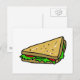 Desenho Whimsical de uma sanduíche de salada com alface, tomate e pepino em pão castanho.