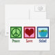 Saladas de Paz e Amor. Um cartão postal de bar de salada fofo para anunciar seu ponto de almoço ou restaurante de comidas de saúde.