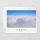 Cartaz de secagem de pilhas de sal com reflexo na água à espera da colheita no Salar, os apartamentos de sal de Uyuni, no sul da Bolívia, com o texto "Uyuni, Bolívia" numa caixa branca e com listras em vermelho, amarelo e verde, as cores da bandeira boliviana.