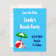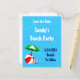 Um cartão postal personalizado de Salve a Data com uma divertida arte temática de praia ou piscina com uma bola de praia vermelha, guarda-sol verde, sandálias de férias e óleo bronzeador em um fundo azul aquático com ondas onduladas. Clique em Personalizar para alterar fontes, tamanho e muito mais, e até salve seu design para mais tarde.