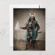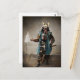 Uma foto colorida impressionante de um povo japonês vestido em uma armadura tradicional do comandante de samurai japonês em cheio, carregando um bastão de comando (escame) em sua mão.