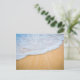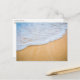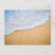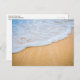 Um postal com uma fotografia de uma praia ouro marrom arenosa com surf branco de espuma.