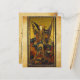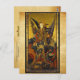 Descrição única e fantástica das Ruas. Michael Archangel como cavaleiro medieval. Tempera e ouro no painel. Gonzalo Pérez, início do século 15. Um design elegante e clássico com um velho pergaminho.