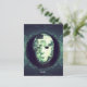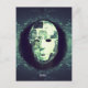 Uma representação assombrosa e surreal de uma máscara quebrada suspensa em um vazio escuro e etéreo. A superfície quebrada e irregular da máscara reflete texturas geladas, contrastadas por um monóculo pendurado e um fio verde solitário, evocando uma conexão críptica com forças invisíveis. Abaixo dela, a palavra simples, porém assustadora, "Olá", convida a um encontro perturbador com o desconhecido.