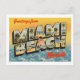 Este é um clássico cartão-postal estilo vintage que apresenta a frase "Saudações de Miami Beach, Flórida". As letras grandes e estilizadas de MIAMI BEACH contêm cada uma uma cena única do famoso destino da Flórida, incluindo praias arenosas, palmeiras e pessoas desfrutando do oceano. O design tem um sentimento nostálgico de meados do século com sua paleta de cores retrô e fonte em negrito, tornando-o perfeito para produtos como cartões-postais, pôsteres e camisetas para qualquer pessoa que ame arte de viagem vintage ou as belas praias de Miami.
